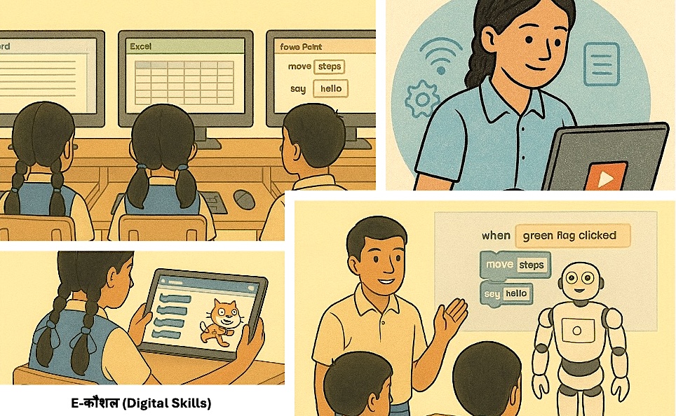 Practical computer literacy (incl. MS Office) and “Coding, AI & Robotics”, delivered through labs, DRCs and camps—especially for girls stepping into tech.